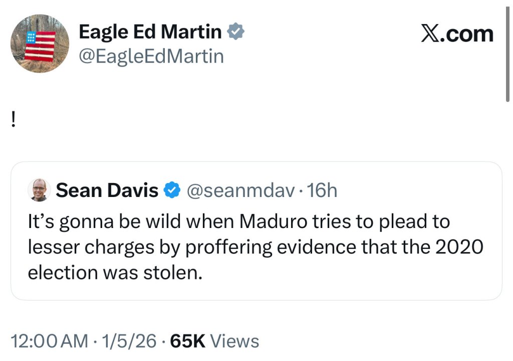 « Ce sera une situation rocambolesque lorsque Maduro tentera de plaider coupable à des accusations moins graves en présentant des preuves que l’élection de 2020 a été truquée », a écrit Sean Davis, pdg du site The Federalist et trumpiste fini.